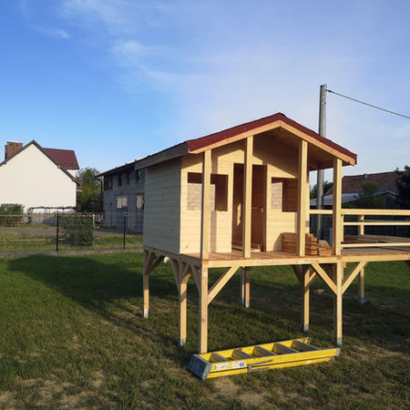 Duży domek dla dzieci robiony na zamówienie. Posiada pomost, ściankę wspinaczkową, huśtawki oraz drabinkę i poręcz. Dwa otwierane okna z całkowicie przeźroczystym akrylem, dwa nie otwierane, drzwi na zamek i docelowo zjeżdżalnię.