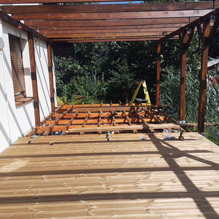 Ponad 65m2 tarasu z Thermo sosny. Całość w kształcie litery L, wzdłuż dwóch ścian domu. W stronę ogródu był spadek więc taras na końcu jest podniesiony i kończy się schodami. Pergola zbudowana jest ponad główną częścią tarasu. W jednym narożnku są kratki na przyszłe winogrono, a od frontu są dwie ruchome ścianki żaluzjowe, które można przestawiać tak, żeby zapewniły cień.