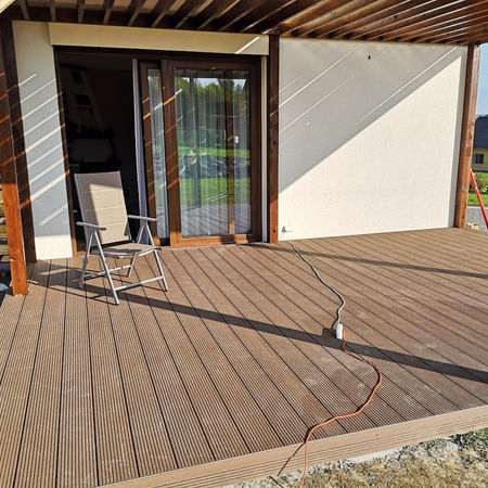 Bardzo ciekawy projekt tarasu i pergoli. Materiały to deska kompozytowa Gamrat w kolorze brązowym oraz jodła malowana impregnatem Sadolin o pasującym kolorze. Pergola nie jest zadaszona stałym dachem, za to ma krokwie rozmieszczone na tyle gęsto , że dają dużo cienia. Ścianki z listewek mają zapewnić (poza cieniem) trochę prywatności. Tak to czasami bywa, że stawia się dom w szczerym polu a dwa lata później z tyłu powstaje 7 bliźniaków.
