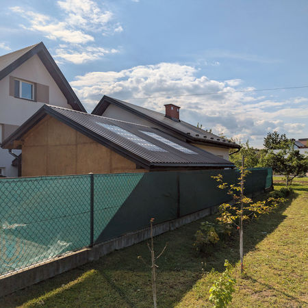 Garaż postawiony obok istniejącego budynku, kryty blachą trapezową T-18 z świetlikami na większej połaci dachu. Całość obita płytami OSB przygotowana pod tynk. Brama Wiśniowskiego, rynny w kolorze czarny, blacha ciemny brąz. Wymiar 5,5m x 5m.