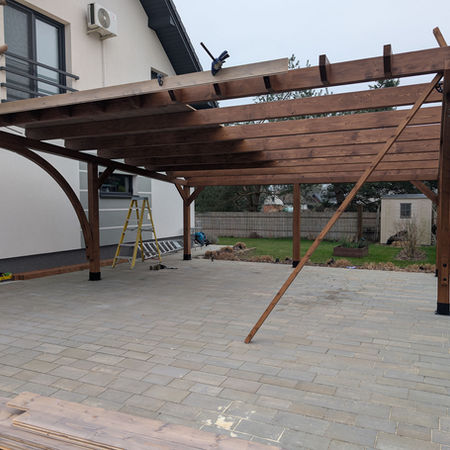 Konstrukcja z łukami które ograniczają obrys na ziemi. Wymiar po dachu 6x6m. Ściany boczne i tylnia zabudowane ukośnymi żaluzjami. Kolory to głęboki brąz i architektoniczny szary marki Flugger.