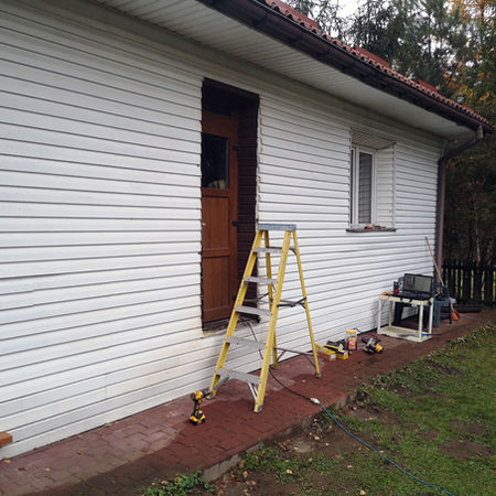 Schody zabudowane poliwęglanem, z zamykanymi drzwiami. Kolor złoty bursztym marki Flugger.