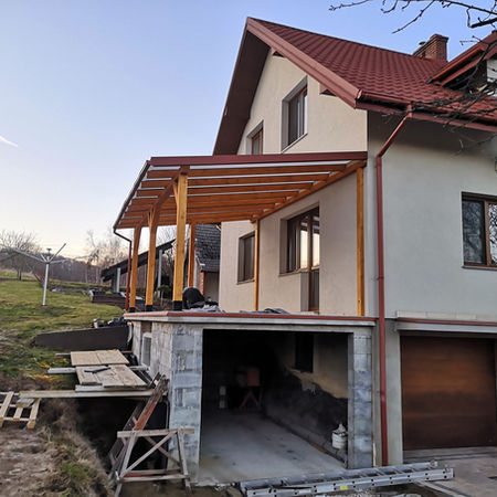 Drewno w kolorze Foxy Brown - Rubio Durogrit. Całość przykryta poliwęglanem komorowym mlecznym grubości 10mm. Rynny odprowadzone